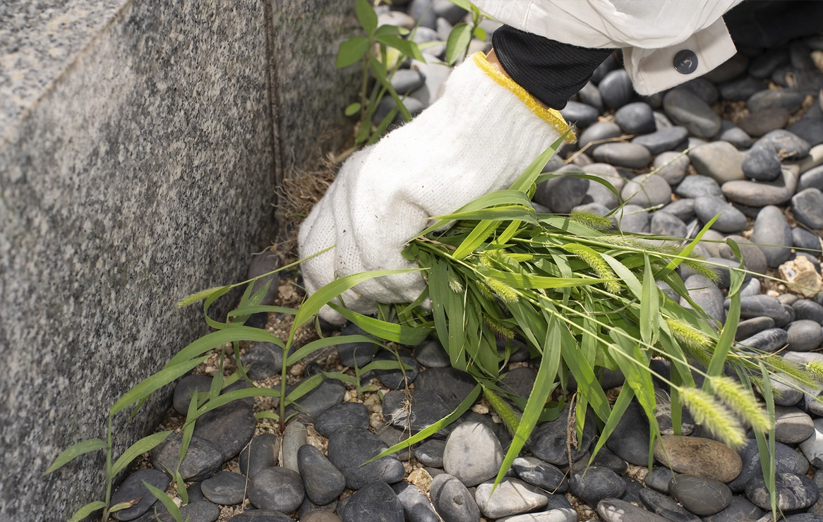 伸びてしまった雑草や積もった落ち葉を、一つひとつ心を込めて手作業で取り除きます。いつお参りにいらしても清々しい、安らかな空間を整えさせていただきます。
